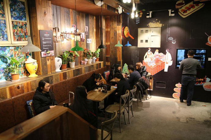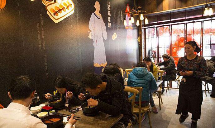 5、“十秒到云南過橋米線”店面裝潢極具民族設計感,契合云南這一民族特色,從民族壁畫、云南彩燈到店小二服飾等細節(jié)都極具云南民族風情,首先給消費者以視覺上的沖擊,可以說是從味覺到視覺全方位為消費者帶來純正的云南風味。